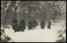 Żołnierze ubrani w długie, sukienne płaszcze i czapki zimowe. Dwaj pierwsi to oficerowie, uzbrojeni w pistolety TT (wzór z 1933). Trzeci z nich to podchorąży pierwszego rokuszkoły oficerskiej (świadczą o tym oznaki na kołnierzu płaszcza oraz obszycia mankietów oznaczające rok nauki). Ostatni żołnierz niesie na plecach radiostację RMB-1. ; 1 fot. czarno-biała ; 14,5x9 cm