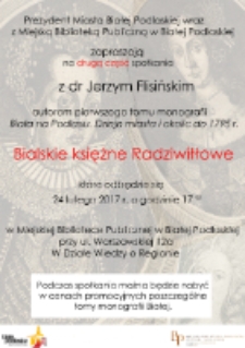 | Plakat : Spotkanie "Bialskie księżne Radziwiłłowe". Cz.2 : spotkanie z dr Jerzym Flisińskim (24.02.2017 r.) | 2020-06-16 |