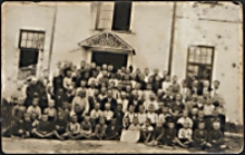 Tytuł: Dzieci na kolonii letniej w Białej Podlaskiej przed budynkiem Szkoły Podstawowej nr 3