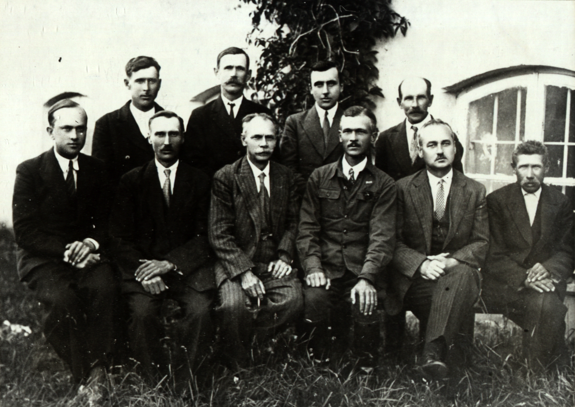1 fot. czarno-biała ; 12x17 cm ; stoi drugi od prawej : Stanisław Skolimowski - sekretarz gminy Witulin