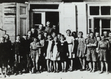 1 fot. czarno-biała ; 11x16,5 cm ; przed budynkiem szkoły, póżniejszkoła mieściła się w zaadoptowanej stodole