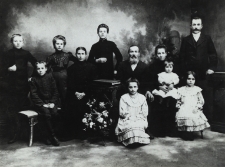 1 fot. czarno-biała ; 16,5x22 cm ; Od lewej : Stanisław Chomiński, Franciszek Charłampowicz, Anna Michałowska z Chomińskich, Zofia Chomińska z Cybulskich, Jan Chomińsk, Ignacy Chomiński -rzemieślnik - kowal, Apolonia Cybulska z Charłampowiczów, Marianna Charłampowicz z Chomińskich, , dzieci : Bronisława Charłampowicz, Zofia Charłampowicz, Ignacy Charłampowicz