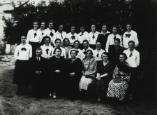 Siedzą: pierwszy z lewej Władysław Grys - nauczyciel j. łacińskiego, w środku: Wanda Madlerowa - dyrektor szkoły, pierwsza z prawej: Aniela Walewska - nauczyciel j. polskiego ; 1 fotokopia czarno-biała ; 17x23 cm