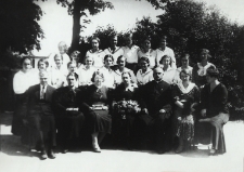 Siedzą: pierwszy od lewej : Władysław Grys - nauczyciel j. łacińskiego, w środku: Wanda Madlerowa - dyr. szkoły ; 1 fotokopia czarno-biała ; 17x23 cm
