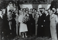 1 fotokopia czarno-biała ; 12,5x17 cm ; Młoda para w otoczeniu członków chóru "Echo Podlasia"