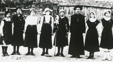 1 fot. czarno-biała ; 7,5x17,5 cm ; w środku: prefekt szkoły ks. Antoni Święcicki, czwarta z lewej: nauczyciela Leokadia Kisielińska