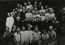1 fot. czarno-biała ; 9x13 cm ; Siedzą od lewej: ks. kanonik Tadeusz Wądołowski (proboszcz), ks. bp Czesław Sokołowski, ks. Julian Jaszewski (wikariusz), Maria Uszczyńska (kierownik kolonii)