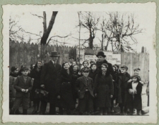 1 fot. czarno-biała ; 6x9 cm ; Wśród uczniów stoją : Stanisław Duński (nauczyciel szkoły) oraz Julian Abramowicz (wiceburmistrz Białej Podlaskiej)