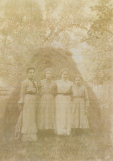 1 fotokopia czarno-biała ; 17x12 cm ; Stoją od lewej: Helena Achmatowicz z Buczackich - żona sędziego Sądu Apelacyjnego w Wilnie Bohdana Achmatowicza; Stefania Buczacka - przed II wojną światową była sekretarką prezydenta Warszawy Stefana Starzyńskiego, w czasie wojny wyprowadziła z getta wielu Żydów, po wojnie była sekretarką ministra Winiewicza, Żenia Buczacka (zm. 1906) i Zofia Buczacka siostra Stefanii