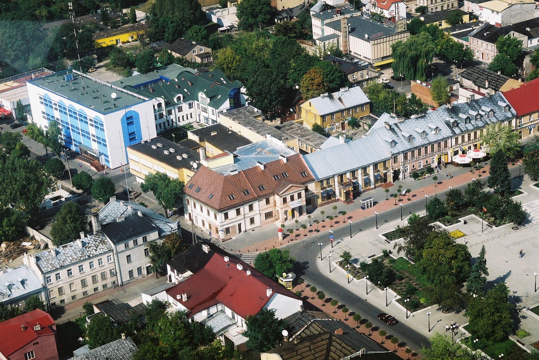 Biała Podlaska (woj. lubelskie) ; Fotografia lotnicza polska ; Widok z lotu ptaka ; Ulica Piłsudskiego (Biała Podlaska) ; Plac Wolności (Biała Podlaska) ; Ulica Krótka (Biała Podlaska) ; Miasta ; Telekomunikacja Polska S.A. (Biała Podlaska ; budynek) ; Budownictwo miejskie ; Ulice ; 2001-
