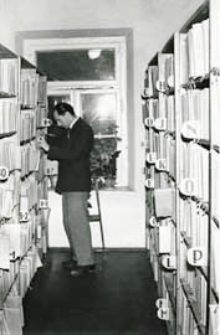 Przy regale stoi Jerzy Kaczyński - kierownik biblioteki