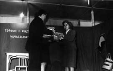 Konkurs czytelniczy dla kobiet zorganizowany przez Zarząd Główny Ligi Kobiet Polskich i Powiatową i Miejską Bibliotekę Publiczną w Białej Podlaskiej w pow. bialskim ; Zinaida Kara kierownik biblioteki w Chotylowie odbiera z rąk przedstawicieli ZMW książki w ramach akcji "1000 książek na 1000 leciew"
