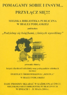 Title: Plakat : [Inc.:] Miejska Biblioteka Publiczna w Białej Podlaskiej pod hasłem "Podziel się książkami, z których wyrośliśmy" prowadzi zbiórkę książek dla dzieci, 1-31 maja 2004 r.