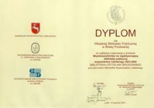 Dyplom dla Miejskiej Biblioteki Publicznej w Białej Podlaskiej za najlepszą organizację w powiecie współzawodnictwa na najaktywniejszą bibliotekę publiczną województwa lubelskiego 2003-2004 "Biblioteka - Czytelnik - Środowisko" pod patronatem Marszałka Województwa Lubelskiego