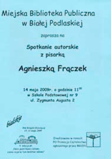 | Druki ulotne : Spotkanie z pisarką Agnieszką Frączek w Oddziale dla Dzieci MBP, 14.05.2009 r. | 2019-07-17 |